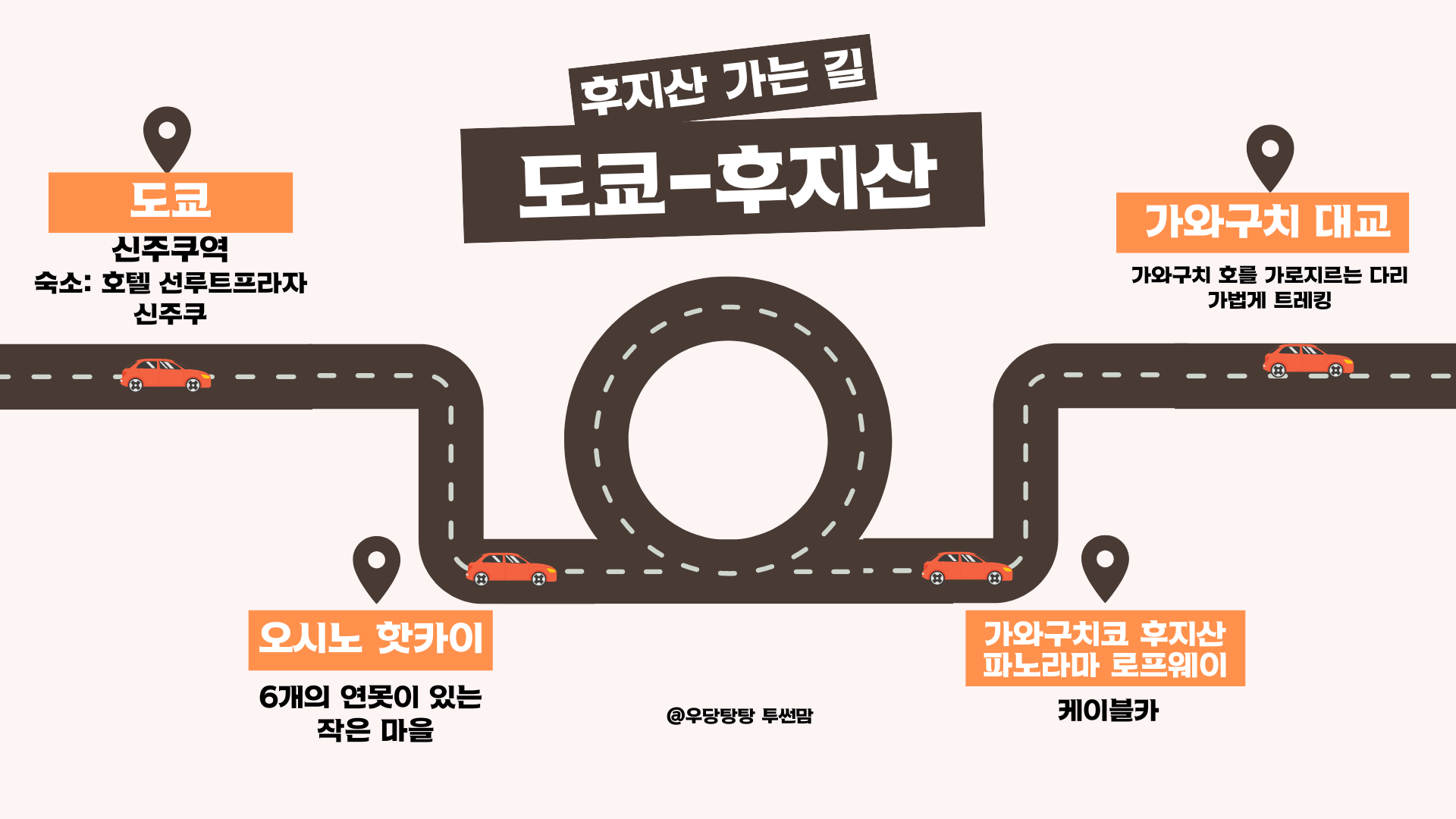 후지산에서 흐르는 물로 이루어진 연못8개가 잇는 작은 마을인 오시노핫카이와 후지 5호중에 두번째로 큰 규모인 가와구치호를 함께 돌아보는 것이 일반적입니다.