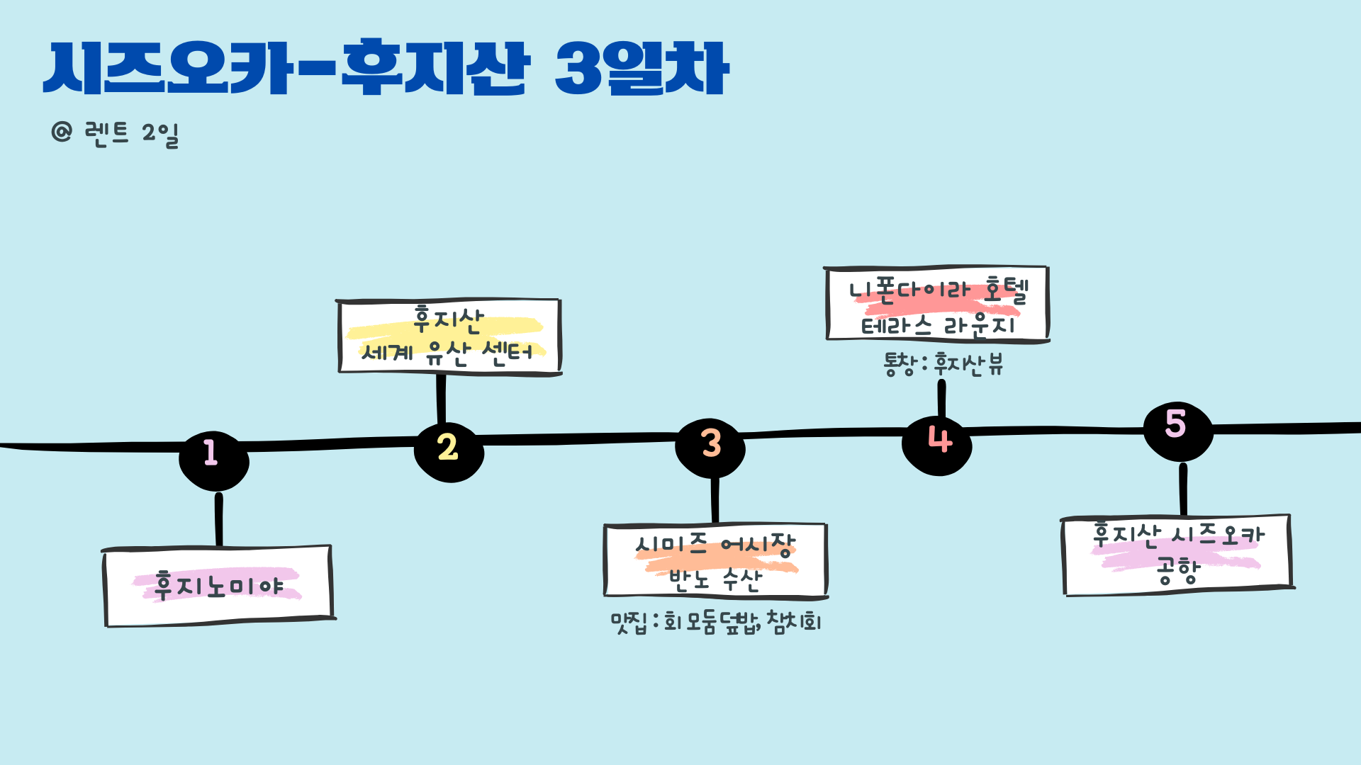 혹시 바쁜 일상 중에 저희 남편처럼 뾰족한 머리위에 하얀눈이 쌓인 후지산을 보고 힐링하고 싶으신 분 계시다면 제가 세운 시즈오카-후지산 2박3일 일정이 도움이 되시길 바랍니다.