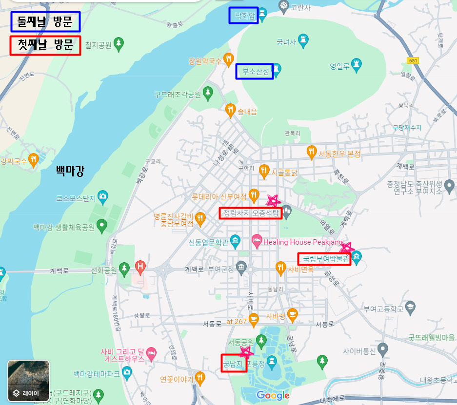 이렇게 1일 차 일정을 마치고 숙소로 돌아갔어요. 숙소를 기준으로 30분 거리 안에 모든 스폿들이 모여있습니다. 사실 유명한 유적지는 백마강 주변으로 다 모여있다고 보시면 됩니다. 다음 글에서는 백제문화단지, 부소산성, 낙화암, 고란사 유람선 후기를 남겨 보도록 하겠습니다.