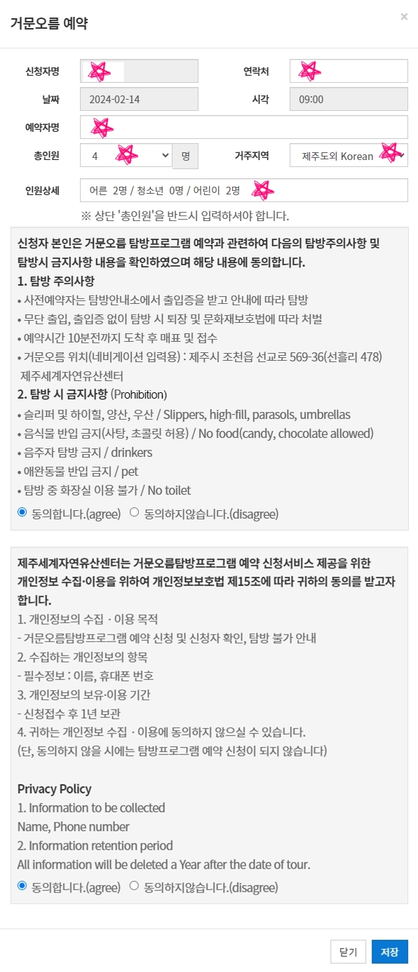 거문오름 예약신청서는 다음과 같습니다. 별표 부분 작성하시면 돼요. 동의하기 누르고 저장하면 끝.