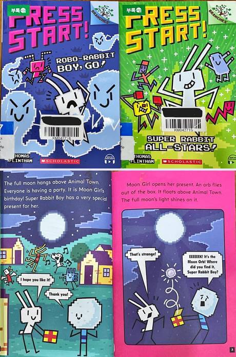 이 책은 남학생들이 좋아할만 한 책입니다. Thomas Flintham의 풀 컬러 책으로 총 12권입니다. Lexile지수 520L로 읽기 쉬운 텍스트와 빠른 줄거리가 재미있습니다. 현실과 컴퓨터 세상 두가지 공간에서 벌어지는 흥미진진한 내용이 담겨 있습니다. 게임을 좋아하는 아이들의 흥미를 불러일으키기 충분합니다. 게임 속 캐릭터 휴퍼래빗 BOY는 엄청 빠르고 용감한 캐릭터입니다. 써니는 이 게임을 좋아하는 소년입니다. 게임을 하면서 써니가 질때마다 특별한 일들이 벌어집니다. 만화같기도 한 책으로 본격 챕터북으로 넘어가기 전에 부담스럽지 않게 볼 수 있습니다.