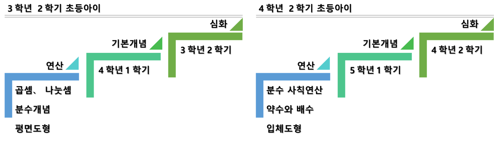 초등수학은 크게 두가지 축으로 나누어 볼 수 있습니다. 대수 파트와 기하 파트입니다. 쉬운 말로 수에 대해 배우고 연산을 해 나가는 부분과 도형 부분이죠. 부가적으로 규칙 찾기, 표와 그래프, 시계와 달력등의 부분도 있지만 큰 가지는 두 개로 보시면 될 거 같아요. 보통 해당학년 책의 목차를 보면 대수와 기하가 섞여서 나옵니다. 해당 나이대에 맞는 수준의 수와 도형을 가르치죠.