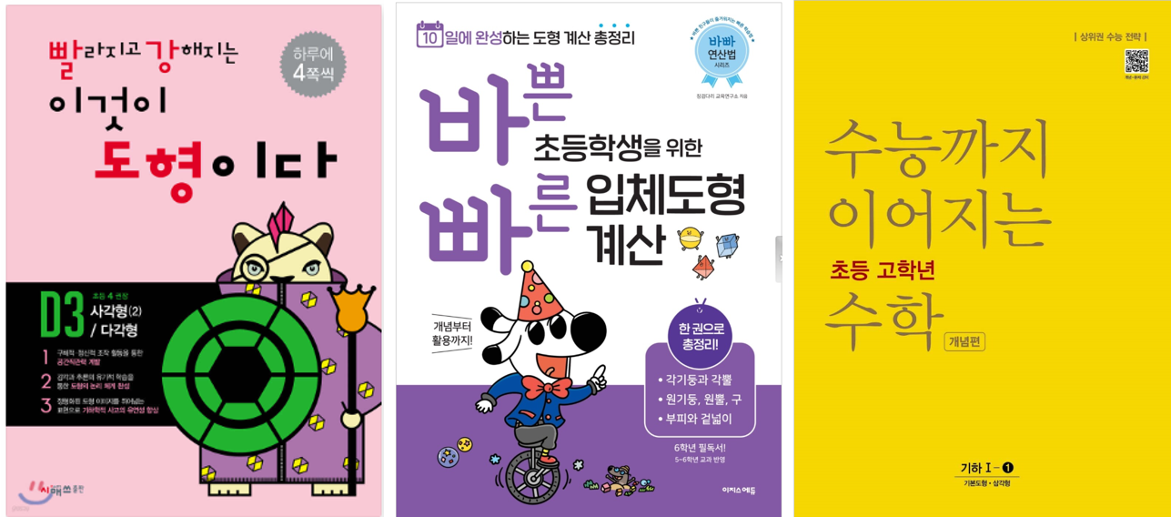 도형 책을 따로 안 하는 분들도 많지만 저는 도형을 따로 분리해서 진행했습니다. 빨라지고 강해지는 이것이 도형이나 시리즈를 했고 방학 때 몰아서 했어요. 이틀에 한 단원씩 했고 거의 그림이고 아주 쉬워서 어렵지 않습니다. 4학년 겨울방학 때 초등 도형은 다 할 수 있었고 기적특강 초등도형세트로 마무리하고 디딤돌에서 나오는 수능까지 이어지는 초등 고학년 수학 기하 개념 파트 풀고 마무리했습니다.