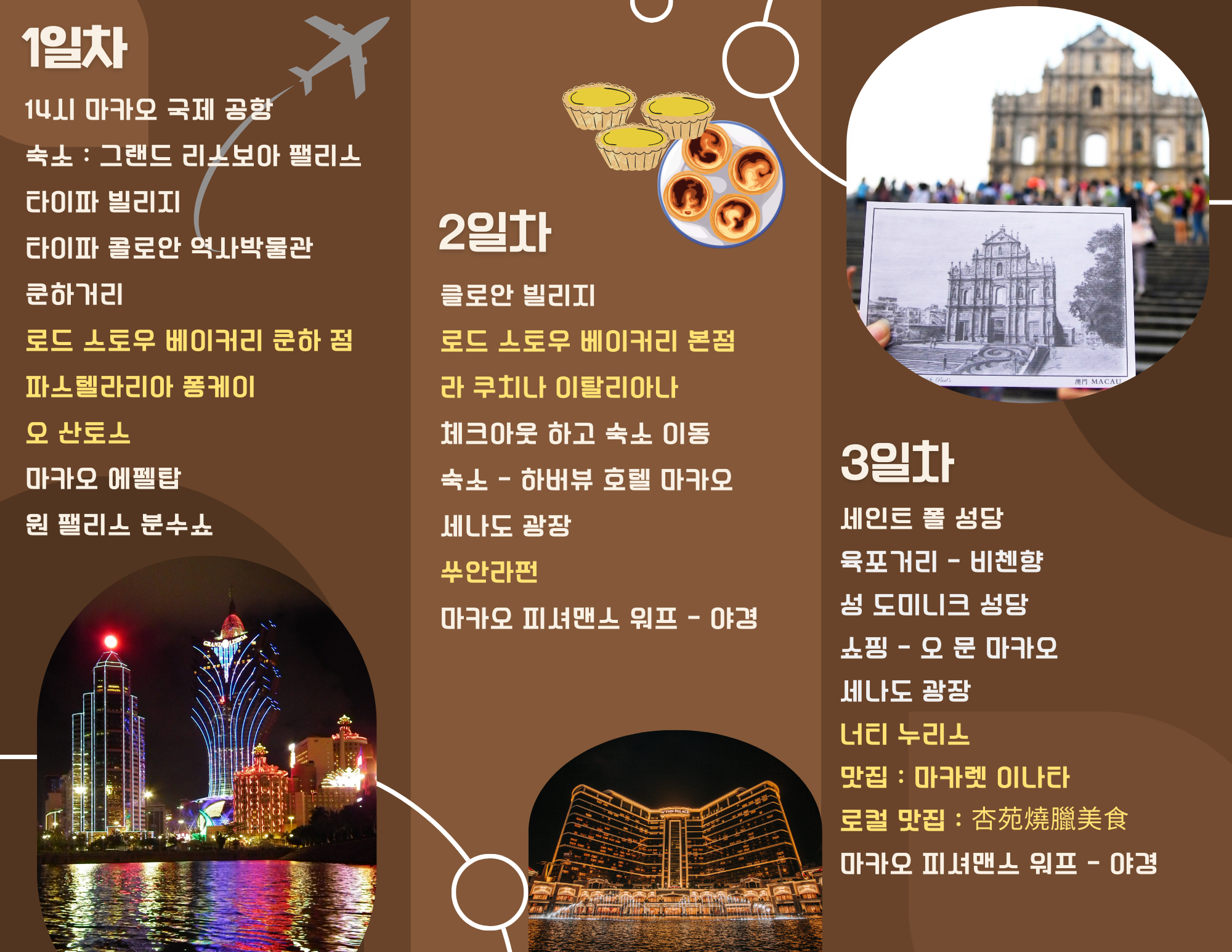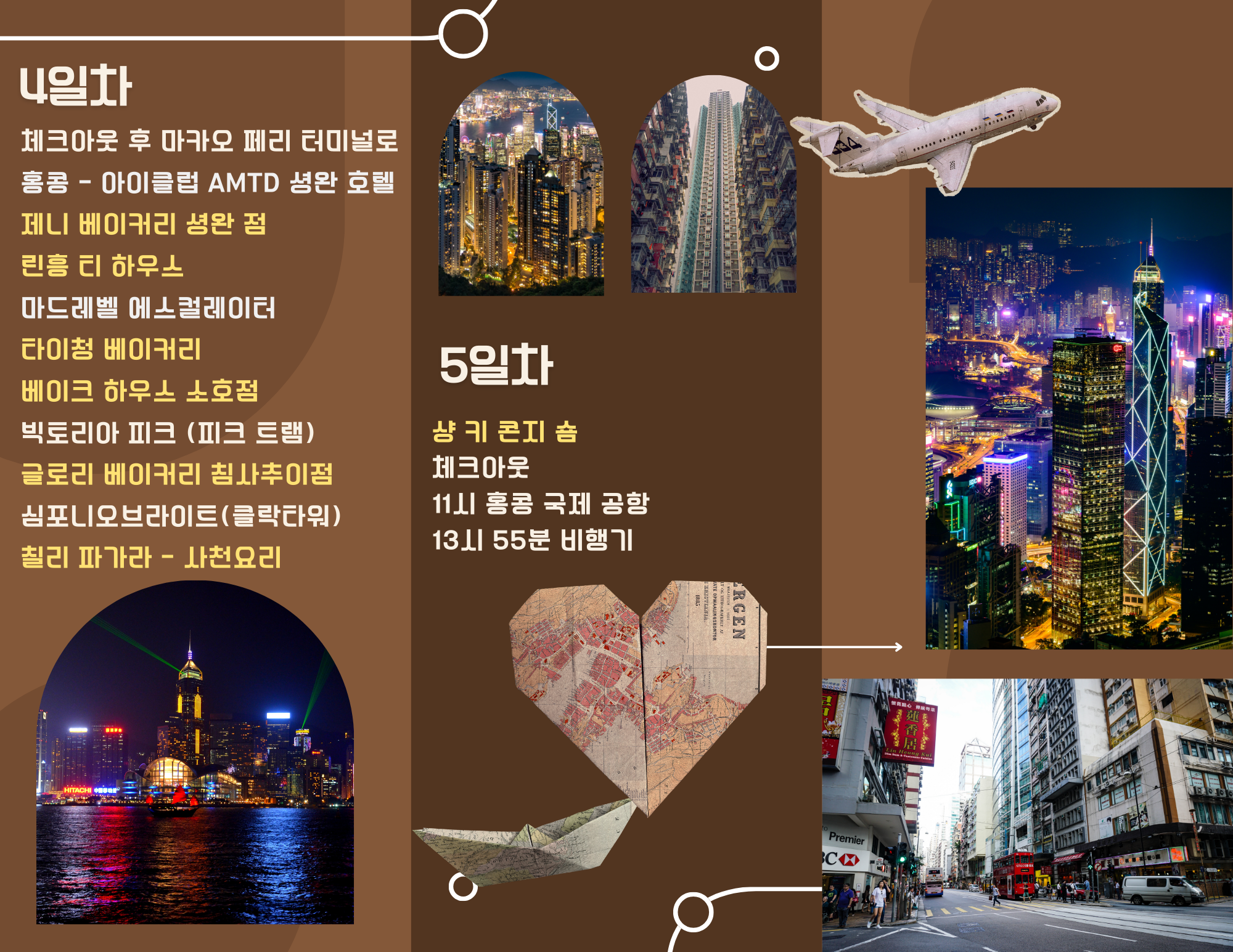위의 내용을 종합적으로 보고 저희 가족이 가고 싶은 곳 반영해서 4박5일 마카오 인 홍콩 아웃하는 여행코스입니다.