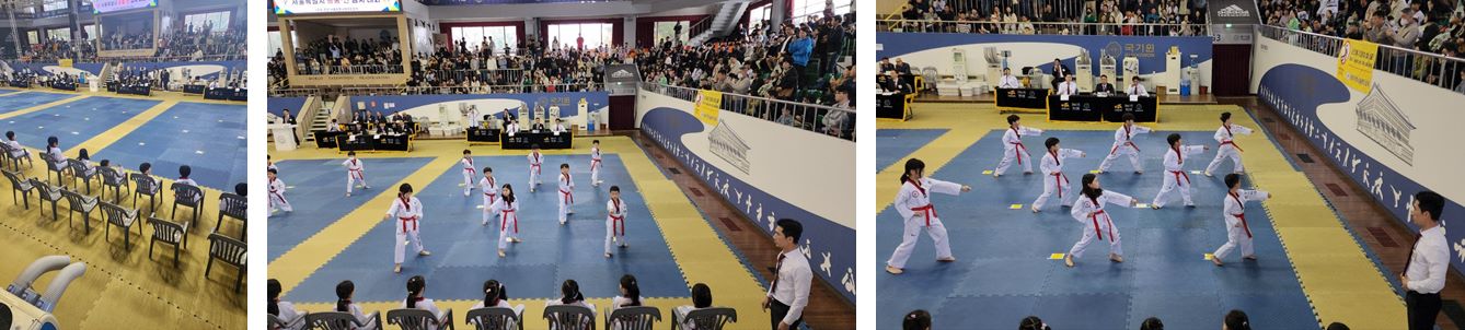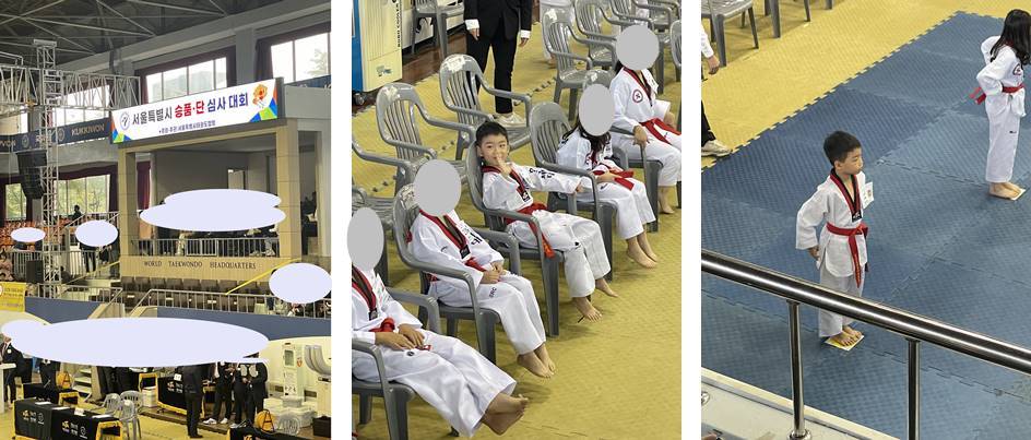9시 첫 타임 심사여서 심사 개회식부터 쭉 다 보았어요. 심사위원 등 관계자 소개부터 국민의례 등등 생각보다는 빨리 빨리 진행되었고 단상을 바라보고 맨 오른쪽 코트에서 태권도 기본동작, 기본 발차기, 품새2개를 보고 자리를 이동하여 맨 왼쪽 코트에서 겨루기 심사보고 끝났습니다.